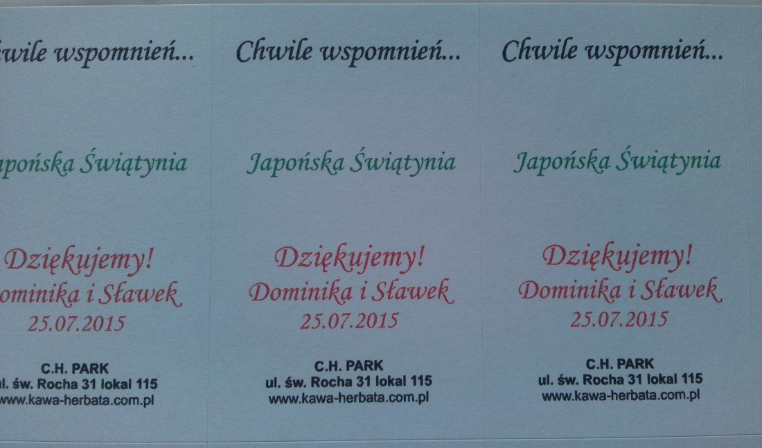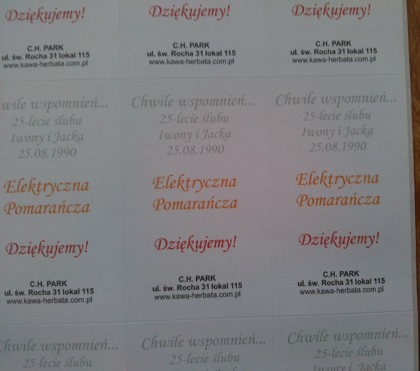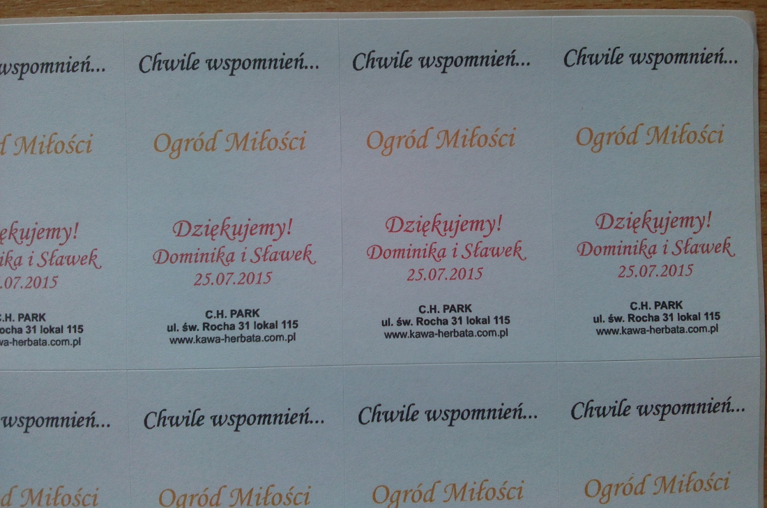 Jednocześnie chcemy Państwa poinformować, iż jesteśmy w stanie wydrukować dowolne etykiety na torebki z kawą / herbatą, które później władamy do koszy / zestawów prezentowych - niżej na zdjęciach można zobaczyć specjalnie przygotowane etykiety na torebki zamówione do prezentów ślubnych czy na 25-lecie ślubu.
